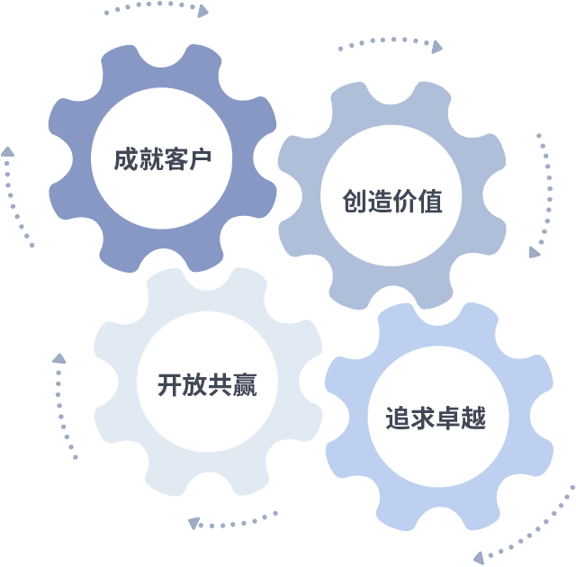 成就客户是一切决策的出发点,,,,创造价值是衡量所有工作的标准,,追求卓越是我们做事做人的态度,,,,开放共赢是我们的格局也是最终的结果。。价值观的齿轮环环相扣,,,推动着组织里的每个人不断向前。。